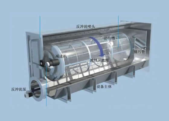污水進(jìn)入設(shè)備后,自控系統(tǒng)啟動(dòng)驅(qū)動(dòng)系統(tǒng)帶動(dòng)轉(zhuǎn)鼓轉(zhuǎn)動(dòng),并同時(shí)啟動(dòng)反沖洗系統(tǒng)。在重力作用下污水由轉(zhuǎn)鼓內(nèi)向轉(zhuǎn)鼓外流出,水中的懸浮物被濾網(wǎng)截留在轉(zhuǎn)鼓內(nèi)。轉(zhuǎn)鼓緩慢轉(zhuǎn)動(dòng),反沖洗水泵抽取濾后水對(duì)濾網(wǎng)進(jìn)行反沖洗。沖洗下來的污物落入轉(zhuǎn)鼓內(nèi)部的收集槽中,通過排污管排到設(shè)備外。