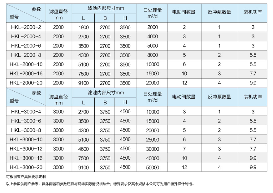 全浸沒(méi)式纖維轉(zhuǎn)盤過(guò)濾器設(shè)備性能參數(shù)及池體主要尺寸