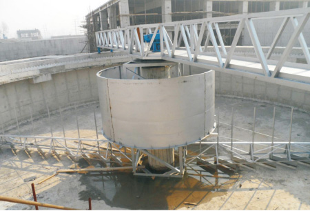 該設備采用中心傳動,污水從工作橋下流入水管,經(jīng)導流筒擴散,均勻地向周邊呈輻射狀流出,呈懸浮狀的污泥經(jīng)沉淀后沉積于池底,驅動裝置帶動中心立軸旋轉,并帶動刮臂及刮泥機板轉動,刮板將污泥刮集后由吸泥管依靠池內靜水壓抽吸至集泥坑,再通過中心排泥管排出池外,而上清液則通過三角形出水堰板溢入出水槽內排出。