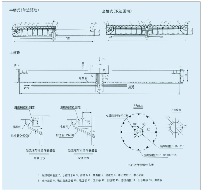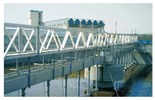 該設(shè)備采用周邊傳動,污水從池中心的進水管流入,經(jīng)穩(wěn)流筒擴散后,均勻地向周邊呈輻射狀流出,呈懸浮狀的污泥經(jīng)沉淀后沉積于池底,驅(qū)動裝置帶動工作橋架沿周邊旋轉(zhuǎn),并帶動吸泥管系統(tǒng)和集泥刮板轉(zhuǎn)動,刮板將污泥刮集后由吸泥管依靠池內(nèi)靜水壓抽吸至集泥槽內(nèi)排入中心泥缸,再通過中心排泥