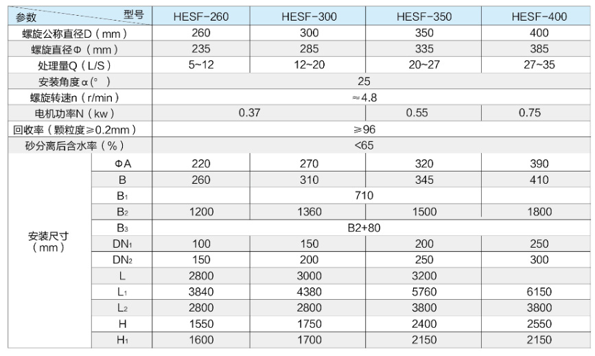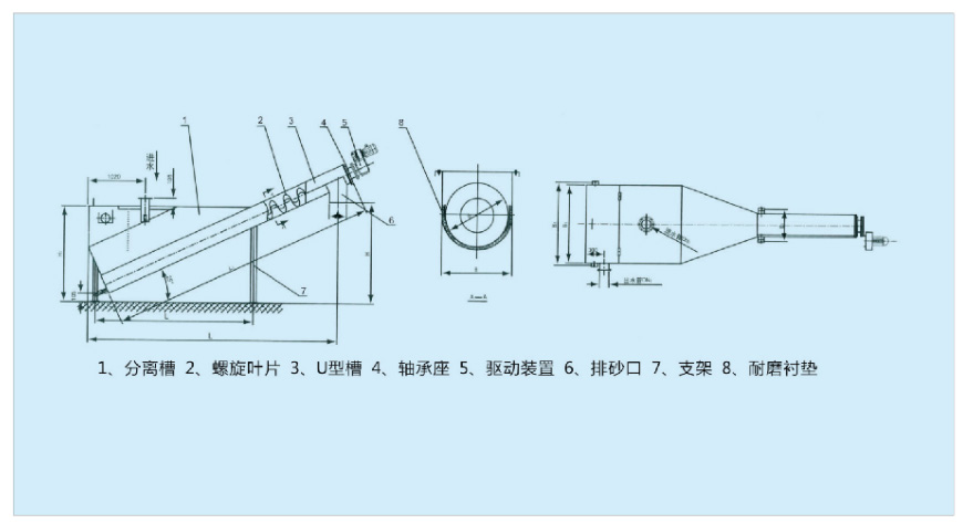 該設備采用無軸螺旋式,砂水混合液從分離器上部輸入,砂礫在砂水分離槽內(nèi)靠重力沉降,并利用無軸螺旋體的旋轉,將砂礫沿25%的U型槽逐漸推至出口處,落入接料筒后外運,分離水則從分離槽溢流口排出,以改善工作環(huán)境和利于外運。