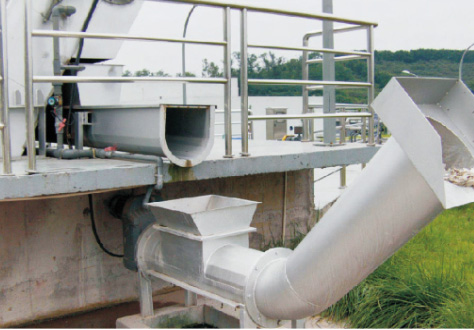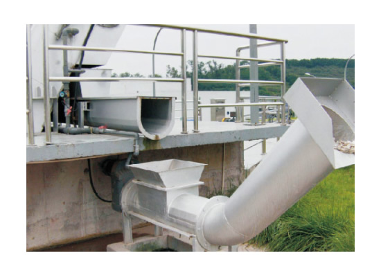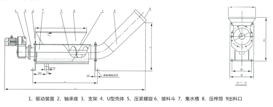 結(jié)構(gòu)及工作原理該設(shè)備采用有軸螺旋式,當物料從進料斗進入,通過螺旋體將柵渣推至出料管道內(nèi),依靠柵渣重力壓縮后推出出料口,直接排放至垃圾小車內(nèi)外運,壓出的廢水通過濾網(wǎng)和集水管經(jīng)排水管排出。